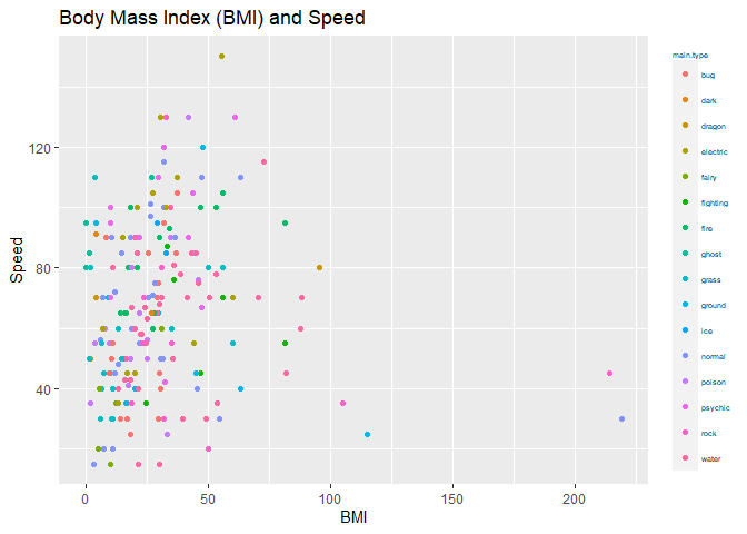 - This scatter plot shows the relationship between BMI (weight/height) and speed. We used type of pokemon to highlight the color. This chart shows no clear relationship between a higher BMI and moving at slower speeds. We can see a few pokemon to the right with BMIs around 50; However, they are not the slowest pokemon.