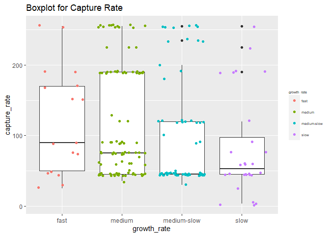 poke %>% ggplot(aes(x=growth_rate, y=capture_rate)) + geom_boxplot() + geom_jitter(aes(colour=growth_rate)) + labs(title = 'Boxplot for Capture Rate') + theme(legend.title = element_text(size = 5), legend.text = element_text(size = 5))