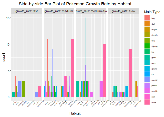 labs(x="Habitat", title ="Side-by-side Bar Plot of Pokemon Growth Rate by Habitat") + theme(axis.text.x = element_text(angle=45, size=5), legend.text = element_text(size = 6), plot.title = element_text(hjust = 0.5) )